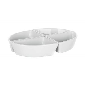 Servírovacia sada oválna porcelánová BIANCA v bielej farbe, sa skladá z oválneho podnosu 19 x 13 cm a 4 mištičiek rôzneho tvaru.