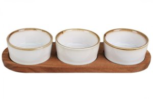 - servírovací set misiek pre najrôznejšie príležitosti- materiál: kamenina s lesklou glazúrou- každá miska má štýlový podtáček z agátového dreva- perfektný pre servírovanie predjedál, pochutín, dipov a omáčok- …
