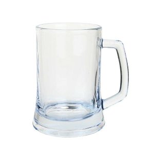 Pivný pohár z masívneho skla s uchom s objemom 500 ml, priemer 85 mm a výška 155 mm.