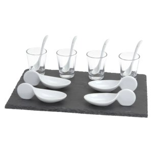 - servírovací set misiek (kanapiek) a pohárov s lyžičkou na tácke pre najrôznejšie príležitosti - materiál: porcelán / sklo / bridlice - farba: biela / transparentná / šedá - perfektný pre servírovanie predjedál, …