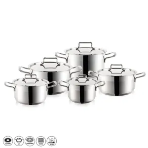 Súprava riadu s pokrievkou. Kastról 1.2 (pr. 16cm, v. 10cm), kastról 2.3 litre (pr. 18cm, v. 10cm) kastról 3 litre (pr. 20 cm, v. 10 cm), kastról 4.3 litra (pr. 22 cm, v. 12 cm) a kastról 6.2 litra (pr. …