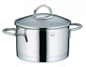 Kastról z nerezovej ocele 18/10, objem 5 l, priemer 24 cm, výška 12 cm, so sklenenou pokrievkou s otvorom na odvod pary.