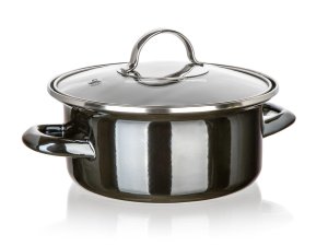 Hrniec + sklenená pokica, priemer. 18 cm, 1,3 l, METALLIC Black. priemer: 18 cm výška (bez pokrievky): 8 cm objem: 1,3 l čierna metalíza Smaltovaný hrniec METALLIC Black so sklenenou pokrievkou.