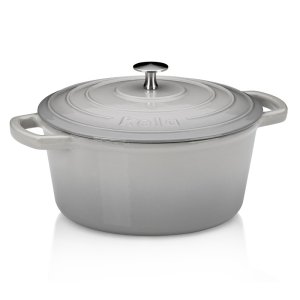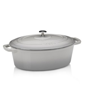Zo série kela Calido: Oválny pekáč v šedej farbe s lesklým povrchom a vekom je dlhý 33 cm, široký 26 cm a má objem 6,0 litrov.