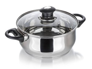 Kastról z nerezovej ocele 18/10, objem 2l, priemer 18 cm, výška 8, 5 cm, so sklenenou pokrievkou s otvorom na odvod pary.
