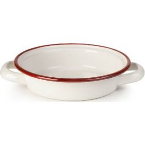 Mini oválny kastrólik s ušami bielej farby s červeným okrajom.