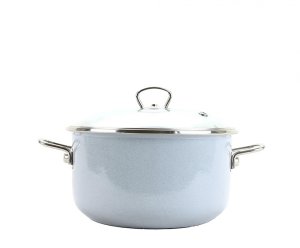 Smaltovaný hrniec bucľatého tvaru s pokrievkou.