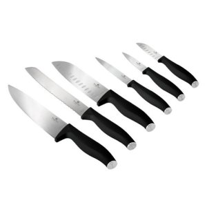 10dielna sada nožov, nerezová oceľ, antracitový dizajn, mäkké rukoväte, bambusový stojan.