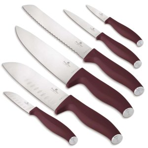 Prineste do svojej kuchyne sofistikovaný štýl a maximálnu funkčnosť s touto elegantnou sadou 6 nožov v hlbokom tóne matnej bordó, doplnenú o luxusný magnetický vešiak z agátového dreva.