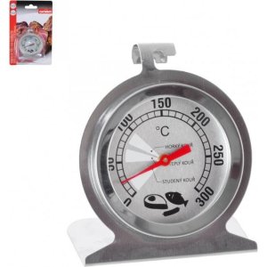 Nerezový teplomer do udiarne. Rozsah merania od 0 do 300 ° C, stupnica po 10 ° C, vonkajší priemer 5 cm, dĺžka 16 cm.