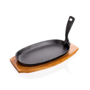 Liatinová panvica 23 x 14 cm na drevenej doske, odnímateľné liatinové držadlo na vyberanie panvice z rúry.