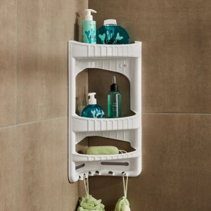 Trojposchodová rohová plastová polica s háčikmi na zavesenie, určená na montáž na stenu.