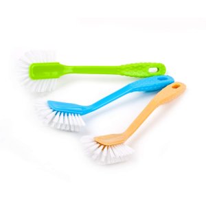 Plastová kefa na riad so syntetickými štetinami vhodná na odstraňovanie hrubých nečistiť z riadu.