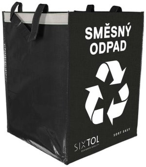 Tašky na triedený odpad Sort Easy sú farebne odlíšené podľa druhu odpadu – žltá na plast, zelená na sklo, modrá na papier, červená na nápojové kartóny, šedá na kov a čierna na zmiešaný odpad.