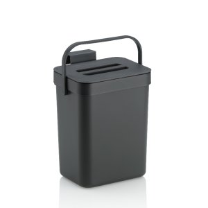 Malý organický odpadkový kôš v tmavo šedej farbe je dokonalým kuchynským pomocníkom pre každého, kto oceňuje úsporu miesta a funkčnosť.