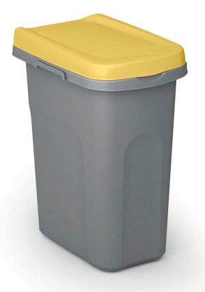 Odpadkový kôš s výklopným vekom v žltej farbe.