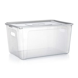 Nízka krabica s vekom a kolieskami pre ľahkú manipuláciu, transparentný plast.