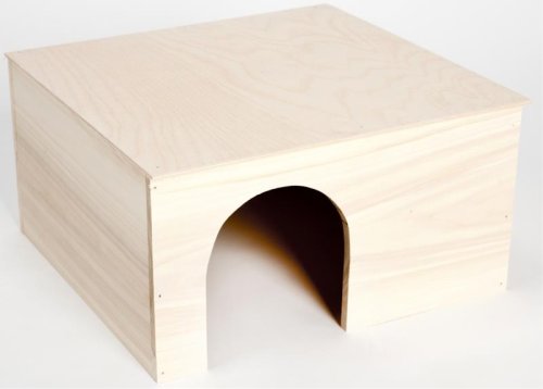 Priestranný domček z kvalitnej preglejky, bezpečnej pre drobné cicavce (preglejka s certifikátom na výrobu detského nábytku). Dostatočne priestranný vchod a priestor vo vnútri domčeka. Rovná strecha domčeka slúži ako poschodie, poskytuje priestor navyše. Rozmery: šírka 37 cm, hĺbka 37 cm, výška 25 cm