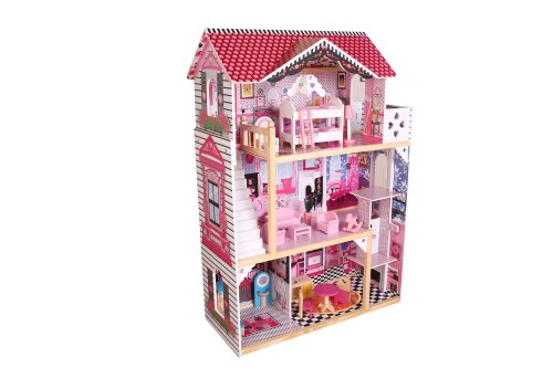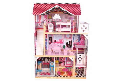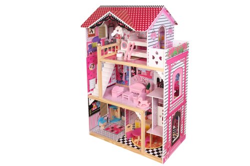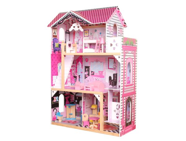 Domček pre bábiky. Vyrobený z dreva. Veľkosť v zloženom stave 82 x 33 x 118 cm. Balenie obsahuje 18 ks nábytku, schodisko a pohyblivý výťah.