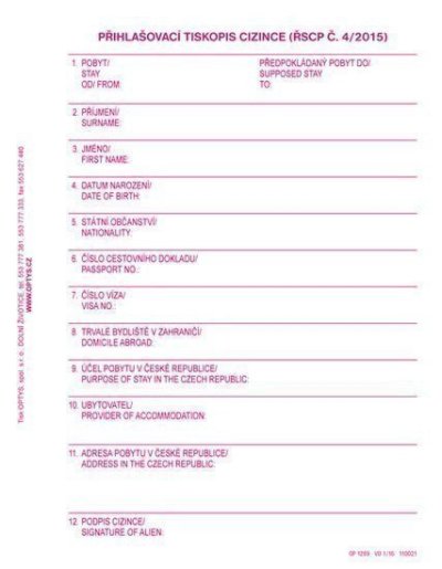 Predtým Ubytovacia kniha pre cudzincov. Samoprepisujúce tlačivo. Blok 2x50 listov. Formát 1/3 A4. Zeleno-biela obálka. Nečíslovaný.
