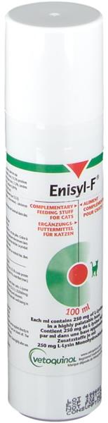 Enisyl-F je doplnkové krmivo s obsahom L-lyzínu. Až 97% mačiek je sérologicky pozitívnych na mačacie herpesvirus (FHV-1), ktorý je príčinou najbežnejšej infekcie dýchacích ciest u mačiek – štúdie dokazujú, že suplementácia L-lyzínom redukuje u mačiek ako klinické príznaky ochorenia, tak vylučovanie samotného vírusu. Zloženie: Aktívna zložka: 250 mg L-Lyzín hydrochlorid v ml Ostatné zložky: purifikovaná voda, sorbitol, rybí olej, xantánová guma, sójový olej, tuniaková príchuť, sójový lecitín, silikagel, karamelová farba, sorban draselný, kyselina citrónová. Dávkovanie: Dospelé mačky: 1 až 2 ml dvakrát denne. Mačiatka: 1 ml dvakrát denne alebo podľa odporúčania veterinárneho lekára.