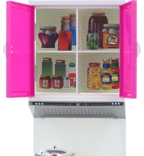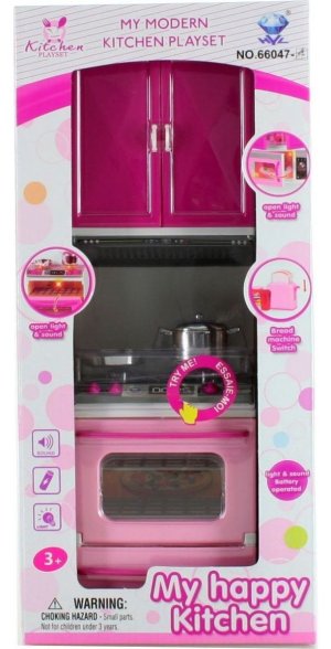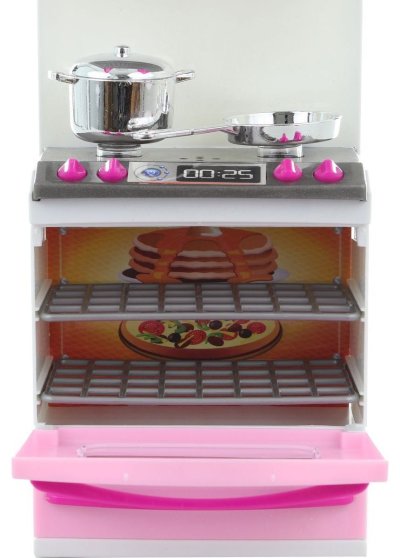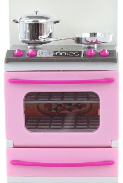 Plastový nábytok pre bábiky. Kuchynská linka s rúrou o rozmere 10 x 31 x 7 cm. Linka má otváracie dvierka a súčasťou je plastový riad. Rúra a platničky svietia a vydávajú zvuky. Napájanie batérie 2x LR44 (sú súčasťou balenia).