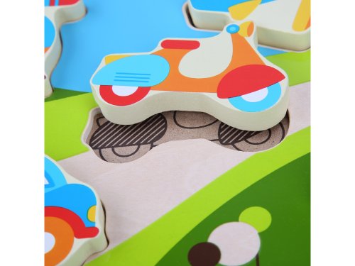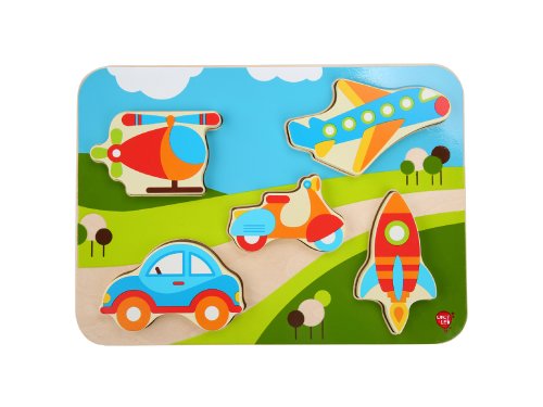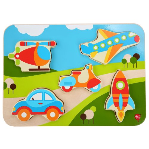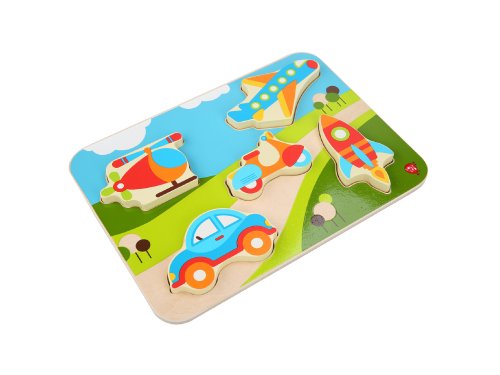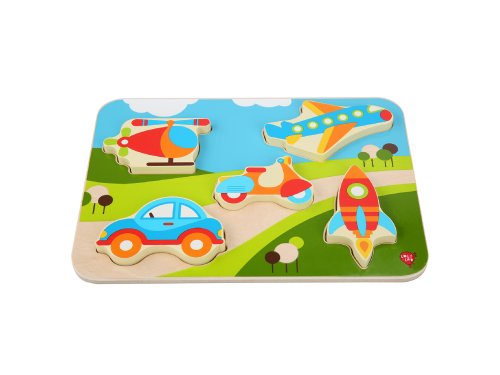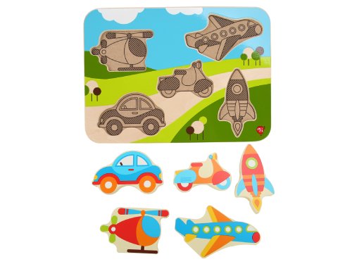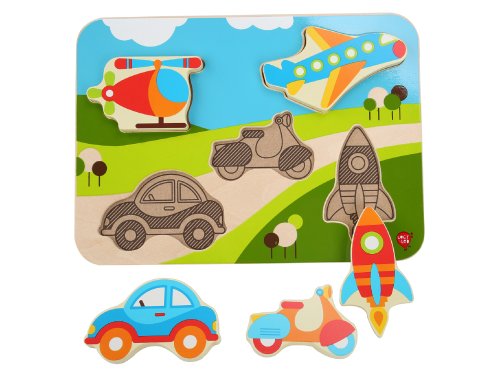 Dopravné prostriedky je drevené vkladacie puzzle bez úchytiek s motívom áut a ďalších dopravných prostriedkov, ktoré potešia nielen malých chlapcov. Na hladkej farebnej doske sú nakreslené rôzne dopravné prostriedky. Päť vystúpených drevených tvarov dopravných prostriedkov je možné jednoducho uchopiť a vložiť do správnych vyfrézovaných drážok na farebnú dosku. Diely sú veľké, krásne ilustrované a deťom sa vďaka svojej veľkosti berú dobre do ruky. Tvar a hrúbka jednotlivých dielikov umožňuje niektorým dopravným prostriedkom aj samostatne stáť. Na tejto vkladačke si deti precvičia jemnú motoriku, priestorovú orientáciu av neposlednom rade trpezlivosť. Výška dosky 21 cm, dĺžka 29 cm, dĺžka dopravného prostriedku cca 10,5 cm, hrúbka cca 1 cm.