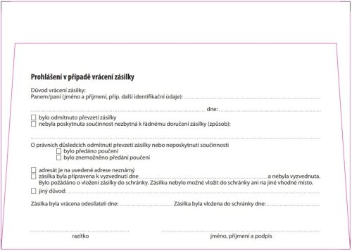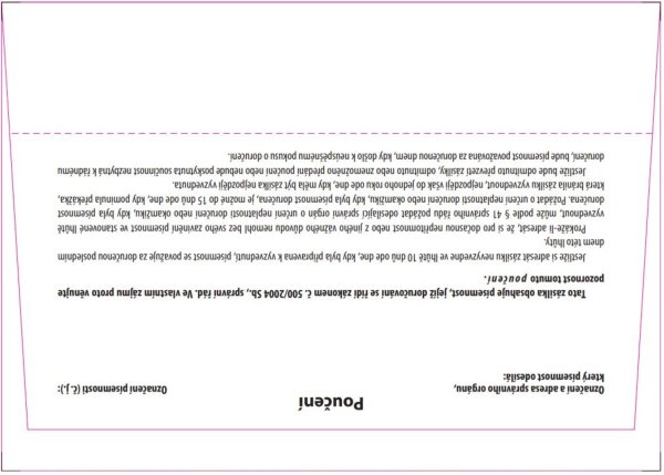 Obálka formátu B6 s doručenkou, bez pruhu - pre správne konanie Samoprepisovacie prevedenie s perforáciou pre ľahšie odtrhnutie klopy Na obálke je uvedený text: Nevracať, vložiť do schránky, uložiť len 10 dní …