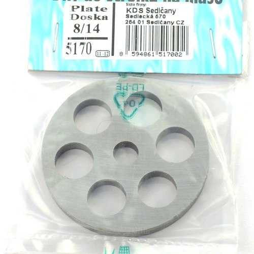 Náhradná mäsoplatňa do mäsostroja č.8, otvory priemer 14 mm. Balené v igelite so závesom. EAN 8594861517002