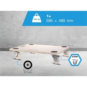 Rozmery: 59 x 49 cm Materiál: prírodná preglejka Hrúbka dosky: 18 mm Protišmykové podložky Priemer kolieska: 75 mm, 2x kolieska s brzdou Nosnosť: 300 kg Vhodná pre mäkké podlahy FSC®? certifikovaný …