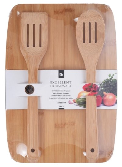 praktická sada dosky a dreveného servírovacieho náčinia-ľahká doska z prírodného materiálu-vyrobené z bambusového dreva-odolné proti vlhkosti a deformácii-doštička je vhodná nielen na krájanie ale aj na servírovanie-ľahké čistenie, rýchloschnúce, ručné umývanie zaistí veľmi dlhú životnosť-rozmery: ,5 x 23 x 1 cm - sada obsahuje 3 ks: - doštička - 2 x dierovaná vareška