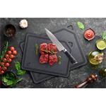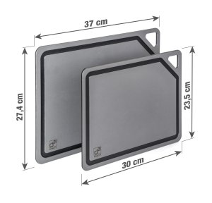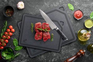 Univerzálne dosky EcoCut z biologicky rozložiteľnej celulózy spájajú odolnosť, šetrnosť k ostrie a moderný dizajn. Ľahko odolajú aj horúcim hrncom, takže ich môžete použiť aj ako podložku pod horúci riad. Vďaka protišmykovej úprave sa dosky pri práci ani nehnú, zostávajú vždy pevne na mieste. Praktická drážka po obvode zachytí šťavy z mäsa aj inej tekutiny, vďaka tomu zostane kuchynská linka po krájaní bez škvrnky. V balení nájdete rovno 2 veľkosti dosiek (30 × 23,5 cm a 37 × 27,4 cm), ktoré si zamilujete pri príprave mäsa, zeleniny, ovocia i byliniek.