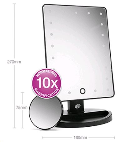Dotykové kozmetické zrkadlo je vybavené 24 samostatnými LED svetlami a je možné ho rozjasniť pre krištáľovo čistý odraz alebo stlmiť pre jemnejšiu atmosféru. Obsahuje mini odnímateľné zrkadlo, ktoré je možné pripevniť na akýkoľvek povrch as 10násobným zväčšením je perfektné pre maximálnu presnosť pri nanášaní make-upu, kontaktných šošoviek, tvarovaní obočia alebo holení.