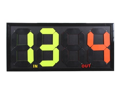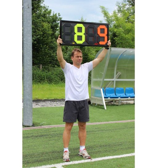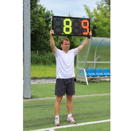Obojstranná mechanická tabuľa pre striedanie Merco Double je veľmi obľúbená medzi trénermi a futbalovými klubmi. Ovládanie tabule je veľmi jednoduché pomocou systému gumičiek. Výhodou tohto modelu je, že z oboch strán je možné vidieť, kto ide do hry a kto von. Číslice sú veľmi dobre viditeľné aj z väčších vzdialeností a to vďaka svetlej žltej a oranžovej farbe. Celkové rozmery ukazovateľa sú približne 84 x 38 x 2 cm. Táto mechanická tabuľa patrí do základných modelov. Ak hľadáte profesionálnejšie tabule pre striedanie, ponúkame aj LED elektronické tabule.