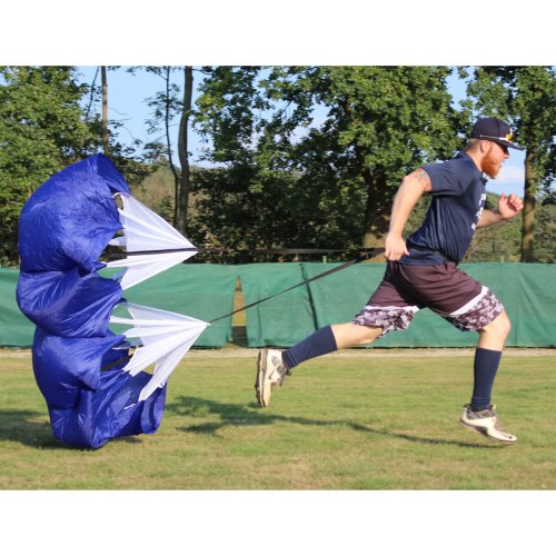 Brzdiaci padák Merco Resistance vám pomocou progresívneho odporu pomôže zdokonaliť silový aj rýchlostný tréning spodnej polovice tela. Zaujímavosťou je, že odpor vzduchu spôsobí spätnú ťažnú silu, takže čím rýchlejšie bežíte, tým väčšia je práve táto ťahová sila. Okrem nárastu dynamiky a vytrvalosti vedie používanie odporového padáku Merco Resistance aj k zdokonaleniu dĺžky a frekvencie kroku, čím je dosiahnutá maximálna finálna rýchlosť. Súčasťou padáku Merco Resistance sú všité panely zo sieťoviny, ktoré zaistia, aby sa ťažné popruhy nezamotávali a stabilizujú padák v priebehu pohybu pre optimálny záber padáku . Brzdiaci padák Merco Resistance je vyrobený z vodeodolného polyesteru, jeho priemer je 140 cm = odpor približne 30 lb (14 kg) a je vybavený 160 cm dlhým polyesterovým popruhom s plastovou prackou, ktorý ľahko a rýchlo pripnete k 5 cm širokému bedrovému pásu s možnosťou nastavenie obvodu až do 110 cm. Balenie odporového padáku Merco Double Resistance obsahuje dva tieto padáky a ako tréningová pomôcka je ideálna pre všetkých športovcov, ktorí potrebujú až dvakrát rýchlejšie zlepšiť rýchlosť a silu spodnej polovice tela pomocou behu.