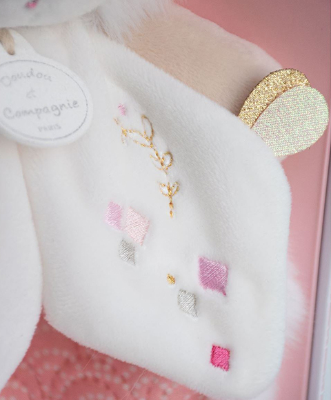 Táto plyšová hračka zajačika bude nevyhnutným spoločníkom Vášho dieťaťa. Jeho hodvábna textúra z neho urobí plyšovú hračku, s ktorou sa budú chcieť deti maznať celý deň. Rozkošný zajačik v béžovej farbe s ružovým bruškom, je posadený do nádhernej darčekovej krabičky s grafikou evokujúcou modernosť i luxus. Táto plyšová hračka je tiež ideálna ako dá rek. Údržba : Perte v kúpeli na 30 °. Prirodzené alebo nízkoteplotné sušenie. Hlavné vlastnosti: mäkký plyš, prémiový materiálv súlade s európskymi normami CEkrásna darčeková krabičkavhodné od narodenia