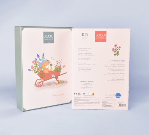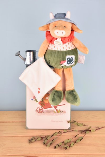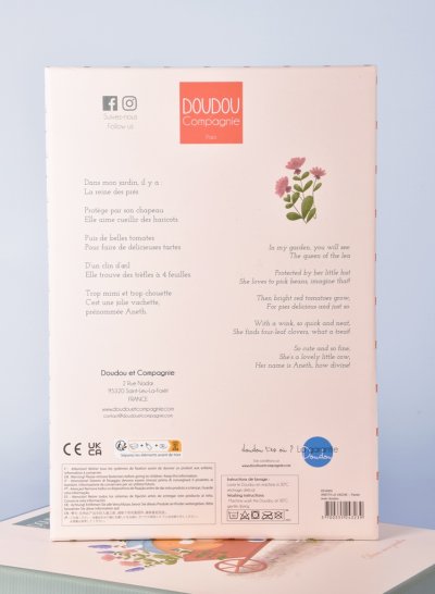 Plyšová kravička Aneth s dečkou o veľkosti 28 cm z kolekcie „Moja záhrada“ je vyrobená z mäkkých prémiových materiálov. Má roztomilú tvár, modrý klobúčik a hebkú dečku a kombinácia rôznych farieb a textúr stimuluje zmysly a rozvíja jemnú motoriku bábätka. Nabáda na skúmanie a maznanie a dieťa zabaví aj upokojí. Je zabalená v peknej darčekovej krabičke na uloženie spomienok (fotografia a ďalšie pripomienky narodenia a rozvoja bábätka) s veršovaným textom v angličtine na spodnej strane. Ideálny darček pre akúkoľvek príležitosť. Kolekcia hračiek „In my garden“ – Moja záhrada je inšpirovaná prírodou. Hračky sú zabalené v atraktívnych darčekových krabičkách ilustrovaných akvarelom a pripomínajú rôznorodosť a farby záhrady, čo je podčiarknuté aj ich menami ako je Ciboulette (pažítka), Aneth (kôpor) a ďalšie. ÚdržbaPerte v kúpeli na 30 °. Sušte prirodzene alebo v sušičke pri nízkej teplote. Hlavné vlastnosti: súčasť kolekcie „In my garden“ prémiový materiál podporuje zmyslový a motorický vývoj dieťaťa v súlade s európskymi normami CE darčeková krabička vhodná od narodenia ideálny darček