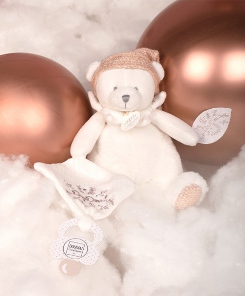 Tento plyšový medvedík je oveľa viac, než len plyšová hračka. Kombinuje funkčnosť a eleganciu zároveň. Na labke má prišitú mäkkú dečku, ktorá je ideálna na maznanie a môže pomôcť bábätku lepšie zaspávať. Na konci dečky sa navyše nachádza praktický úchyt na cumlík, takže bude vždy po ruke. Medvedík má na hlave ružovú čiapočku a pod krkom roztomilý biely golier a hebké labky s ružovými detailmi, ktoré mu dodávajú nežný a priateľský vzhľad. Jemné výšivky a ozdobné štítky pridávajú na osobitosti a nežnosti, vďaka čomu sa stane verným spoločníkom od prvých okamihov Vášho bábätka. Vďaka jemným, trendovým farbám a kvalitným, hebkým materiálom je ideálny pre malé deti, ktorým prináša pocit bezpečia a pohodlia. Skvelý tip na darček, ktorý stimuluje zmysly, rozvíja jemnú motoriku a prináša deťom pocit bezpečia. Údržba: Perte v kúpeli na 30 °. Prirodzené alebo nízkoteplotné sušenie. Hlavné vlastnosti: mäkký plyš, prémiový materiálvhodné od narodenia v súlade s európskymi normami CEideálna ako darček darčeková krabičkanarodeninová kolekcia