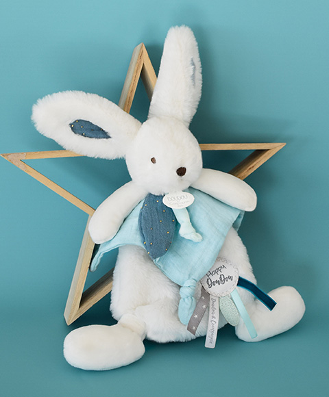 Mäkký zajačik sa rýchlo stane obľúbeným spoločníkom Vášho dieťaťa. Krásny, štýlový s brmbolcom v modrej farbe, zdobený efektnými, šikovne zladenými tkanými stuhami. Je posadený do nádhernej darčekovej krabičky s grafikou evokujúcou modernosť i luxus. Táto plyšová hračka je tiež ideálna ako dá rek. Údržba : Perte v kúpeli na 30 °. Prirodzené alebo nízkoteplotné sušenie. Hlavné vlastnosti: mäkký plyš, prémiový materiál v súlade s európskymi normami CEkamarát, vankúšik, alebo tiež výzdoba detskej izby vhodné od narodenia