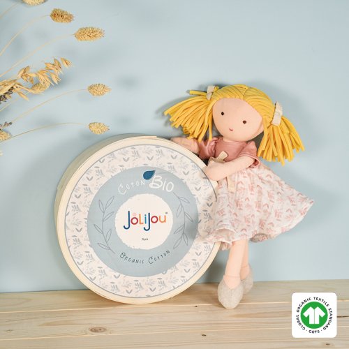 Táto malá roztomilá bábika menom Camélia je vyrobená z organickej bavlny a jej výplň sú 100% recyklované polyesterové vlákna. Bábika má na sebe džersejové tričko a zavinovaciu sukienku s kvetinovým vzorom v ružovej farbe, ktorá jemne ladí s jej mašličkami. Bábika je dodávaná v krásnej okrúhlej darčekovej krabičke z prírodného dreva. Hračka spĺňa európske bezpečnosťou CE normy. Údržba : Perte v kúpeli na 30 °. Odporúčanie: Prirodzené alebo nízkoteplotné sušenie. Hlavné vlastnosti: vhodné od narodeniavyrobené z biobavlnybavlnená tvár, vyšívané oči a ústa v tvare srdcebalené v darčekovej okrúhlej krabičke z prírodného dreva