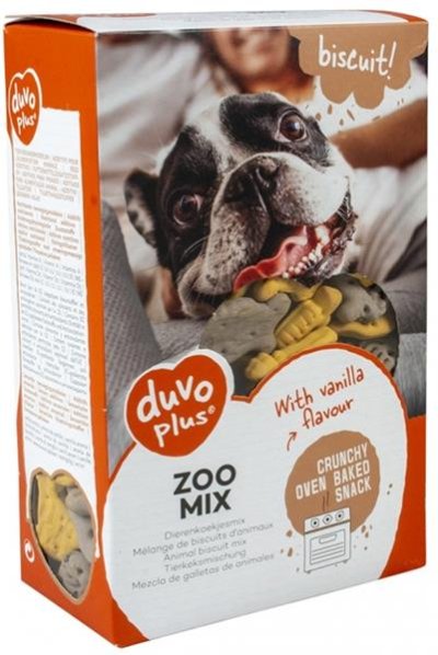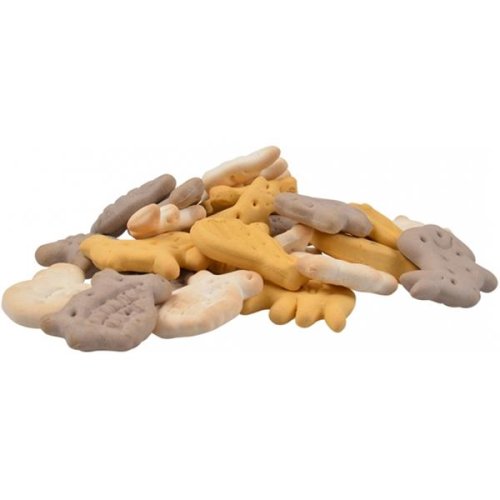 Chrumkavé sušienky v roztomilom tvare zvieratiek, ktoré majú jemnú vanilkovú arómu. Sú ideálnou desiatou alebo odmenou pre vášho psa. Psie sušienky pečené v rúre pre šťastných psov a tým aj šťastných majiteľov. Len to s množstvom maškrty nepreháňajte a psovi poskytnite maximálne 20% z denného príjmu. Zloženie: Obilniny, cukry, oleje a tuky, minerálne látky. Analytické zložky: Hrubý proteín 10%, hrubý tuk 3,5%, hrubá vláknina 1%, hrubý popol 2,7%. Doplnkové látky: (na 1 kg): vitamín A 12500 MJ, vitamín D 3 1000 MJ. Obsahuje EÚ povolené farbivá a antioxidanty, vanilkovú arómu. Dávkovanie: Podávajte ako odmenu či maškrtu, vždy je potrebné úmerne množstvo podaných maškrtiek upraviť množstvo bežného krmiva. Čerstvá pitná voda musí byť vždy k dispozícii.