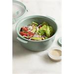 Veľký obedový a desiatový box sa skvele hodí na uchovanie hlavného jedla, chrumkavého pečiva, obložených chlebíčkov, lahodných dezertov a ďalších delikates všetkého druhu. Vzduchotesný a vodotesný poklop v čírom prevedení potom slúži na dôsledné uzavretie nádoby, takže spoľahlivo zabráni oschnutiu, navlhnutiu či inej degradácii pokrmu vo vnútri , napríklad pri pôsobení hmyzu. Váš obed či večera si tak zachová vyššiu kvalitu po oveľa dlhšiu dobu. Integrovaný ventil potom umožní ohrievanie jedál v mikrovlnnej rúre a nádobu aj s tesniacim vekom je možné umývať v umývačke pre ľahšiu a rýchlejšiu údržbu. Súčasťou balenia je tácka pre styk so suchou potravinou , 0,8 l šálka na omáčku a sada príborov s vidličkou, nožom a lyžicou , takže máte všetko potrebné na desiatu, obedovanie alebo večeru.