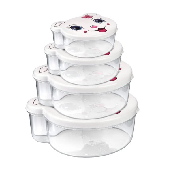Sada boxov na desiatu poteší svojim tvarom deti. Obsahuje 4 rôzne veľkosti boxov s viečkom. Materiál kvalitný plast. Použitie max. 95 °C. Vhodné do umývačky riadu aj do MVT - bez viečka. Obsahuje 4 rôzne veľkosti 0.2 L / 0.3 L / 0.5 L a 0.75 L. EAN 8592381171964