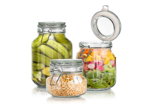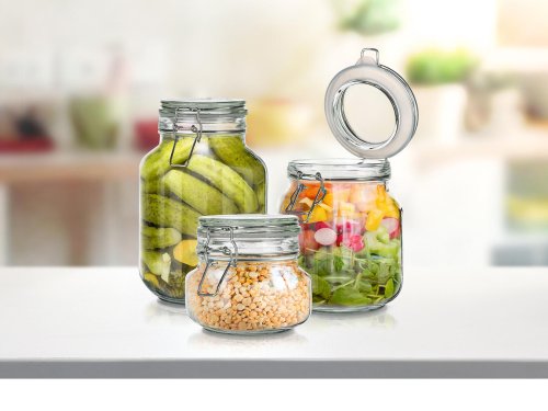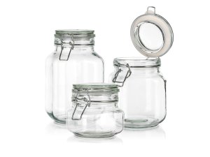 Sada sklenených hermetických dóz EREA so skleneným viečkom a kovovým zatváracím patentom, viečko je osadené silikónovým tesnením, drôtený systém uzáveru nie je vhodný do umývačky (nie je nerezový). Ideálna na uskladnenie suchých potravín - cestoviny, huby atď. alebo nakladanie.