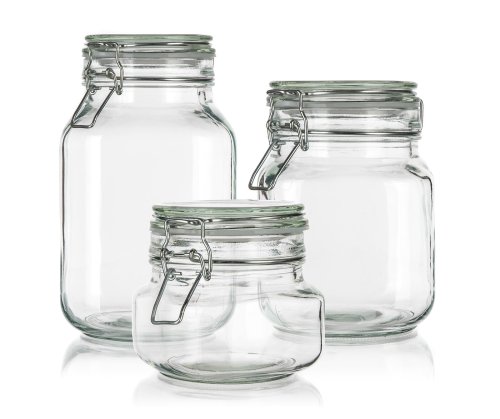 Sada sklenených hermetických dóz EREA so skleneným viečkom a kovovým zatváracím patentom, viečko je osadené silikónovým tesnením, drôtený systém uzáveru nie je vhodný do umývačky (nie je nerezový). Ideálna na uskladnenie suchých potravín - cestoviny, huby atď. alebo nakladanie.