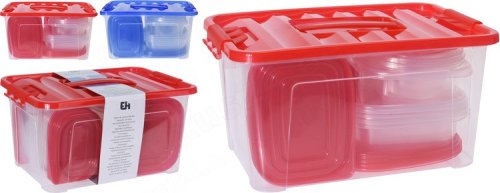 • maxi sada skladovacích dóz na potraviny s viečkom - dózy o rôznych tvaroch a objemoch sú vyrobené z číreho plastu - ideálne pre skladovanie potravín ako je zelenina a ovocie, strukoviny, orechy i cereálie - vhodné tiež pre uchovávanie hotových jedál v chladničke alebo ich prenášanie - každá dóza v sade obsahuje tiež veko - farba: transparentné / červené veko - Sada 27 ks obsahuje: - 1 x skladovacia dóza s vekom a rukoväťou 8 litrov, do ktorej možno uskladniť všetky ostatné dózy - 2 x okrúhla dóza s viečkom 1 liter - 2 x hranatá dóza s viečkom 0,75 litra - 4 x hranatá dóza s viečkom 0,75 litra - 5 x hranatá dóza s viečkom 0,7 litra - 8 x hranatá dóza s viečkom 0,28 litra - 4 x guľatá dóza s viečkom 25 litrov - 1 x guľatá dóza s viečkom 0,1 litra