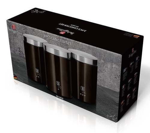 Sada, obsahujúca 3 kusy dizajnových dóz na potraviny v čiernom prevedení - telo i veko sú vyrobené z nerezovej ocele - určené predovšetkým na skladovanie suchých potravín - dózy sú ideálne na kávu, čaj, cukor, múku, tetoviny, bylinky, škrupinové plody, atď. - štýlové riešenie ako uchrániť potraviny pred vlhkosťou, nečistoty neabsorbuje pachy potravín - jednoduchá údržba - farba: čierna metalická - Sada, obsahujúca obsahuje 3 kusy - rozmery dóz: 11 x 18 cm - značka: berlingerhaus