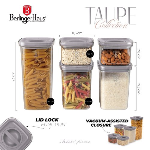 Prineste do svojej kuchyne eleganciu a funkčnosť s našou úložnou sadou z kolekcie Taupe. Táto sada je navrhnutá tak, aby poskytovala vynikajúci výkon a dlhú životnosť. Taupe farba dodáva sade moderný a štýlový vzhľad, ktorý sa hodí do každej kuchyne.