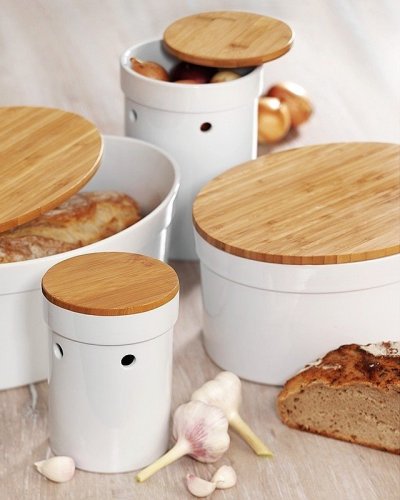 - keramická dóza vhodná predovšetkým pre skladovanie cesnaku - rovnako tak možno uložiť akúkoľvek ďalšiu zeleninu alebo potraviny - bambusové veko - vďaka perforovanému dizajnu sa vo vnútri nezadržiava vlhkosť a potraviny ...