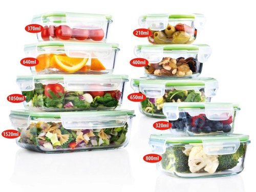 S touto kuchynskou sadou alpina získate celkom 9 rôznych nádob na potraviny s vekom. K dispozícii sú menšie veľkosti 210, 320, 370, 400 a 640 mililitrov, ktoré sú ideálne pre ovocie a desiaty. Ale máte k dispozícii aj väčšie veľkosti 650, 800, 1050 a 1520 mililitrov, ktoré môžete použiť na skladovanie kompletných jedál.